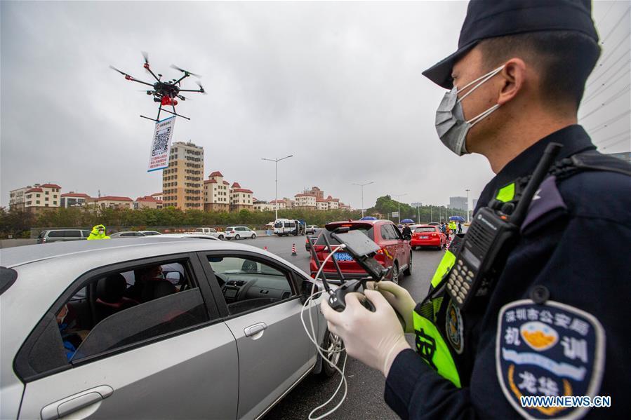 A police officer operates a drone carrying a QR code placard near an expressway toll station in Shenzhen, south China's Guangdong Province, Feb. 11, 2020. As a measure to help prevent and control novel coronavirus, an online register system for vehicles coming back to Shenzhen has been put into use since Feb. 8. To increase the efficiency, local police officers used drones to carry a QR code at the expressway exits for drivers to get registered with less contact with other people. (Photo by Lai Li/Xinhua)