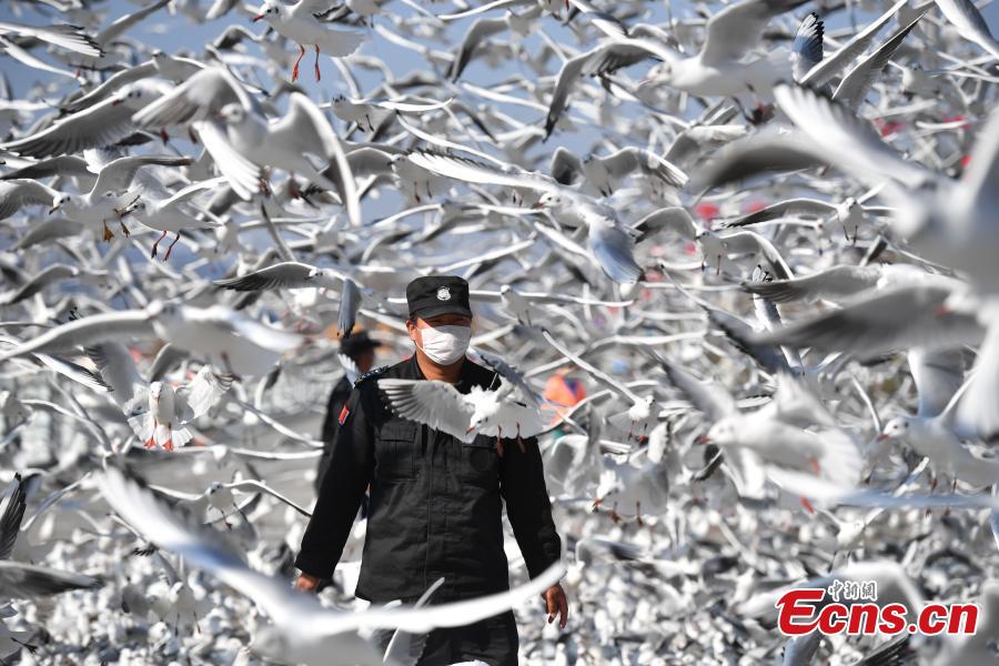 A staff member feeds black-headed gulls by the bank of Dianchi Lake in Kunming, southwest China's Yunnan Province, Feb. 4, 2020. As many parks close due to the outbreak of pneumonia caused by novel coronavirus, local authorities arrange staff to feed black-headed gulls twice a day to make sure they overwinter safely. (Photo/China News Service)