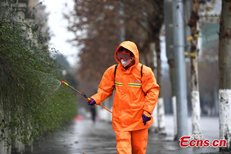 A sanitation worker sprays disinfectant on a street in Southwest China’s Chongqing municipality. (Photo/China News Service)