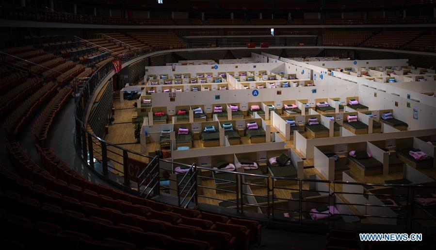 Photo taken on Feb. 12, 2020 shows the interior view of a temporary hospital converted from Wuhan Sports Center in Wuhan, central China's Hubei Province. With the fundamental facilities being set up, the temporary hospital with a total of 1,100 beds is ready to admit patients with mild symptoms caused by the novel coronavirus. (Xinhua/Cheng Min)
