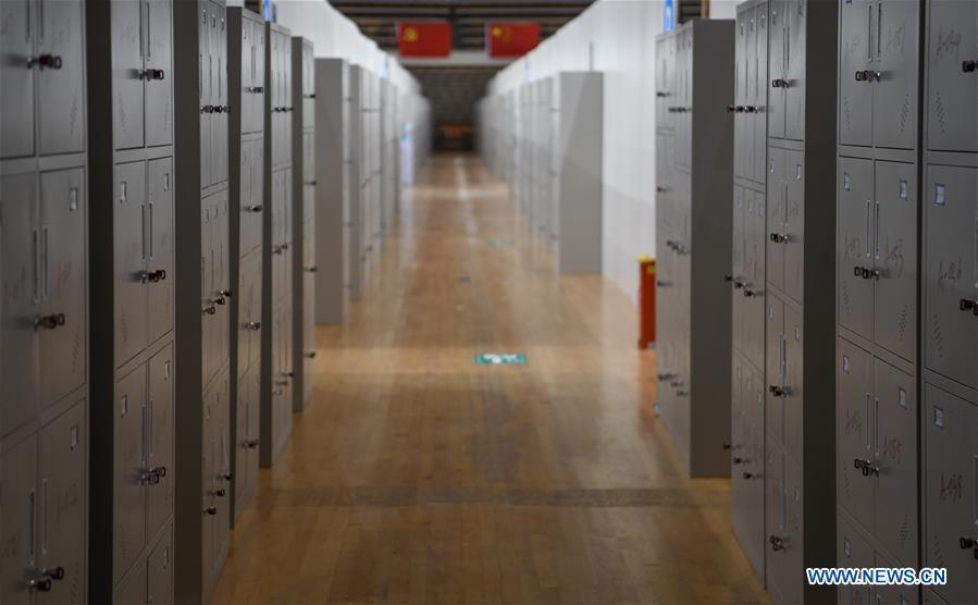 Photo taken on Feb. 12, 2020 shows lockers at a temporary hospital converted from Wuhan Sports Center in Wuhan, central China's Hubei Province. With the fundamental facilities being set up, the temporary hospital with a total of 1,100 beds is ready to admit patients with mild symptoms caused by the novel coronavirus. (Xinhua/Cheng Min)