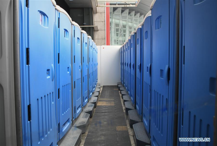Photo taken on Feb. 12, 2020 shows toilets at a temporary hospital converted from Wuhan Sports Center in Wuhan, central China's Hubei Province. With the fundamental facilities being set up, the temporary hospital with a total of 1,100 beds is ready to admit patients with mild symptoms caused by the novel coronavirus. (Xinhua/Cheng Min)