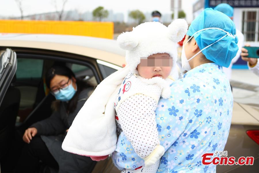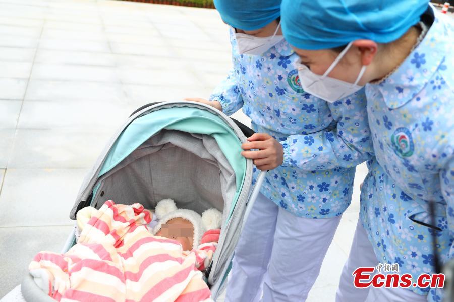 Medical workers discharge a recovered COVID-19 patient, who is a 7-month-old baby, from the Xianghu area of the First Affiliated Hospital of Nanchang University in Nanchang, east China's Jiangxi Province, Feb. 19, 2020. The 7-month-old baby infected with the novel coronavirus was discharged from hospital after 9 days of treatment in east China's Jiangxi Province.