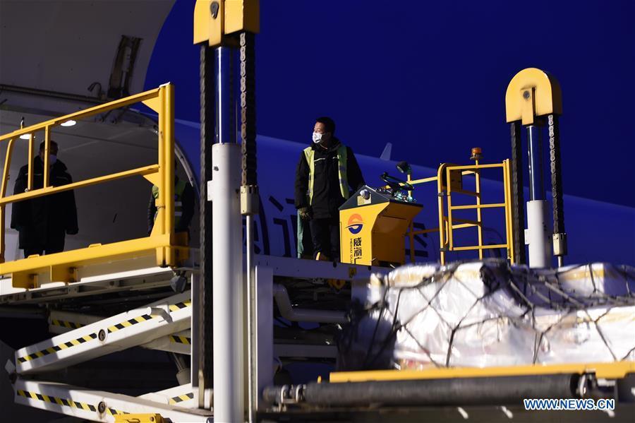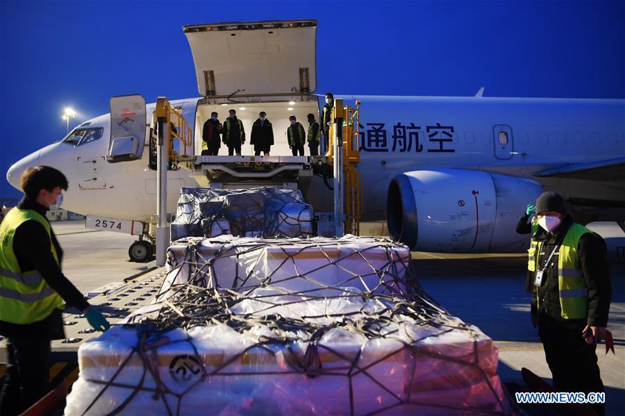 Staff members load materials onto a cargo plane bound for Wuhan of central China's Hubei Province at Zhongchuan International Airport in Lanzhou, northwest China's Gansu Province, Feb. 19, 2020. A cargo plane bound for the epidemic-hit city of Wuhan took off from here on Wednesday, carrying traditional Chinese medicines, protective materials, food and living materials to help the fight against the novel coronavirus disease (COVID-19) there. (Xinhua/Fan Peishen)
