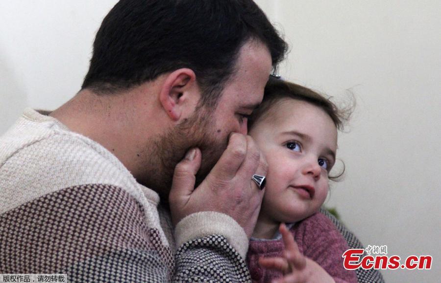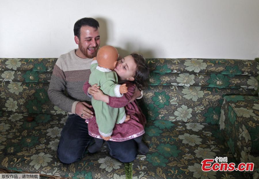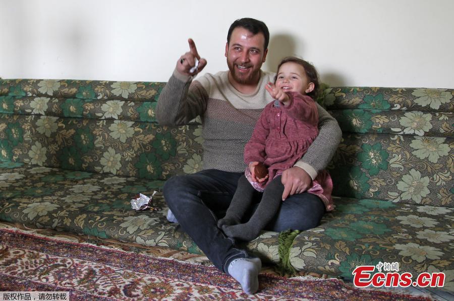 Syrian father Abdullah al-Mohammed sits with his three-year-old daughter Salwa at their home in Sarmada, a town in Syria's last rebel pocket in the Idlib province, which Russian-backed Syrian regime forces are trying to crush on February 19, 2020. In Syria's Idlib, there's no escaping the war, so Abdullah al-Mohammed says the only way he found to reassure his daughter Salwa was to turn the shelling into a game. A video in which she laughs every time an explosion goes off was widely shared on social media in recent days as a heartening but grim reminder of Idlib residents' daily lives.(Photo/Agencies)