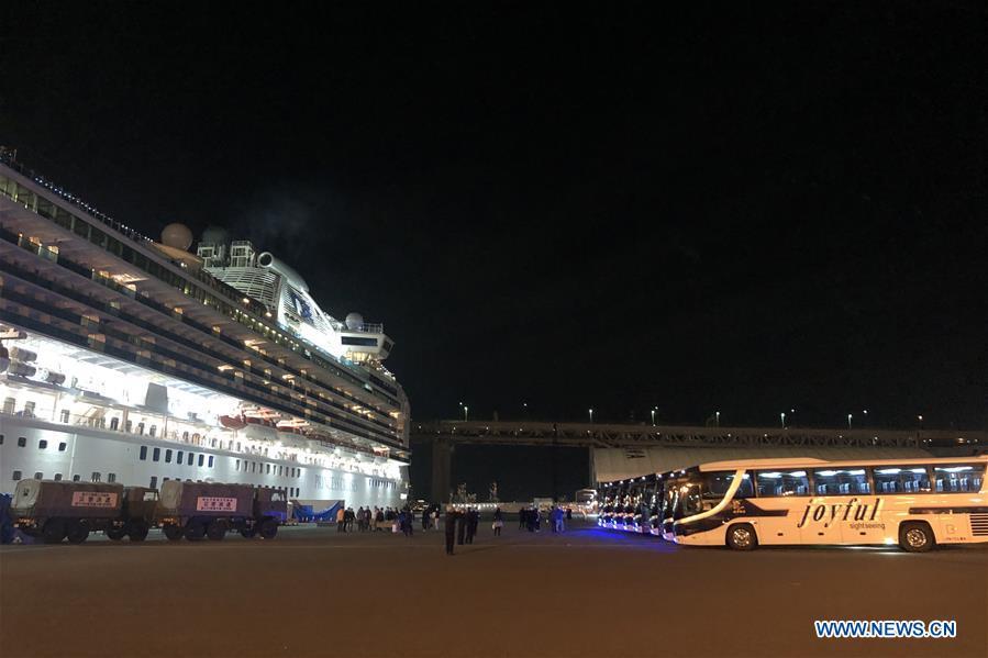 Buses are seen waiting to transfer passengers on the Diamond Princess cruise ship to the Haneda International Airport, at the port of Yokohama in Japan, Feb. 19, 2020. The first chartered flight arranged by China's Hong Kong Special Administrative Region (HKSAR) government arrived in Hong Kong on Thursday morning, bringing 106 Hong Kong residents stranded on the novel coronavirus-inflicted Diamond Princess cruise ship back from Japan. (Xinhua)