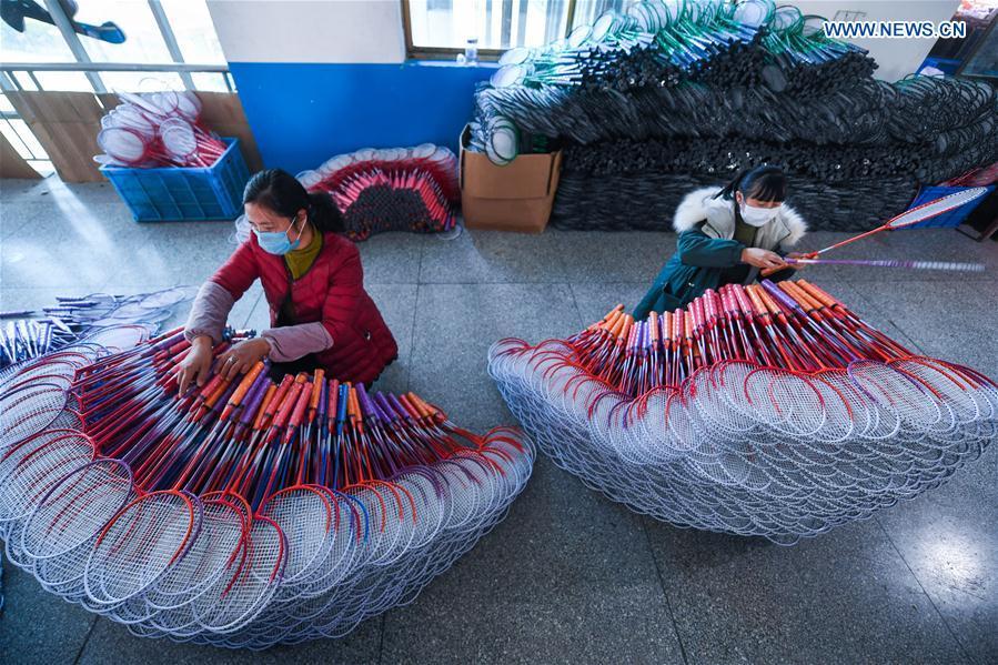 Workers produce rackets at the workshop of a sporting goods company in Shangguan Township of Hangzhou, east China's Zhejiang Province, Feb. 20, 2020. The township used big data technology to visualize the epidemic control and production resumption information, to help local enterprises restart production amid the fight aganist the outbreak of the novel coronavirus disease (COVID-19). (Xinhua/Xu Yu)