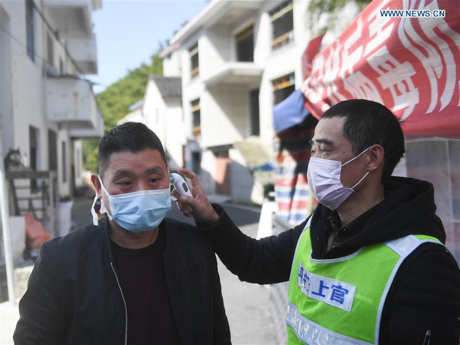 A staff member checks a villager's body temperature at a checkpoint in Fangcun Village of Shangguan Township in Hangzhou, east China's Zhejiang Province, Feb. 20, 2020. The township used big data technology to visualize the epidemic control and production resumption information, to help local enterprises restart production amid the fight aganist the outbreak of the novel coronavirus disease (COVID-19). (Xinhua/Xu Yu)