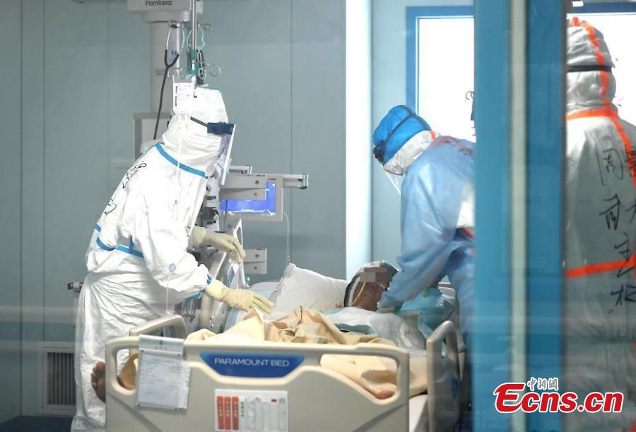 Epidemiologist Li Lanjuan(L), a member of the high-level expert team convened by the National Health Commission, checks the condition of a conoravirus-infected patient in intensive care unit ward of the Renmin Hospital of Wuhan University in Wuhan, Central China’ s Hubei province, Feb. 20, 2020.(Photo: China News Service/An Yuan)