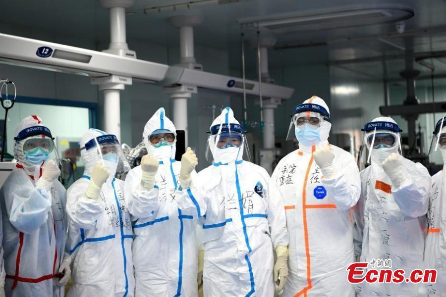 Epidemiologist Li Lanjuan(C) with other medical workers cheer up patients in the Renmin Hospital of Wuhan University in Wuhan, Central China’ s Hubei province, Feb. 20, 2020.(Photo: China News Service/An Yuan)