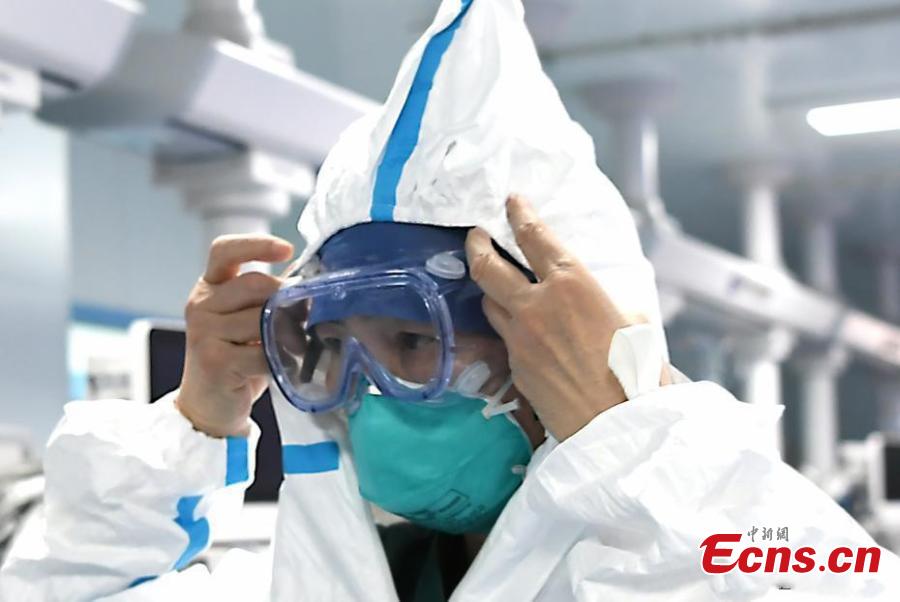 Li Lajuan, a 73-year-old epidemiologist and who is also a member of the high-level expert team convened by the National Health Commission, wears protective goggles before entering an intensive care unit ward in Renmin Hospital of Wuhan University in Wuhan, Central China’ s Hubei province, Feb. 20, 2020. (Photo: China News Service/An Yuan)