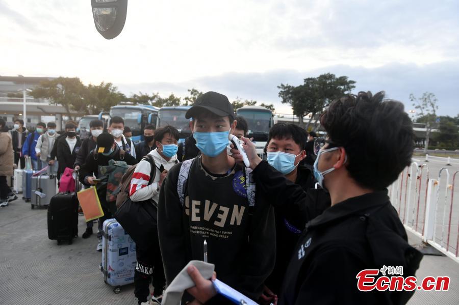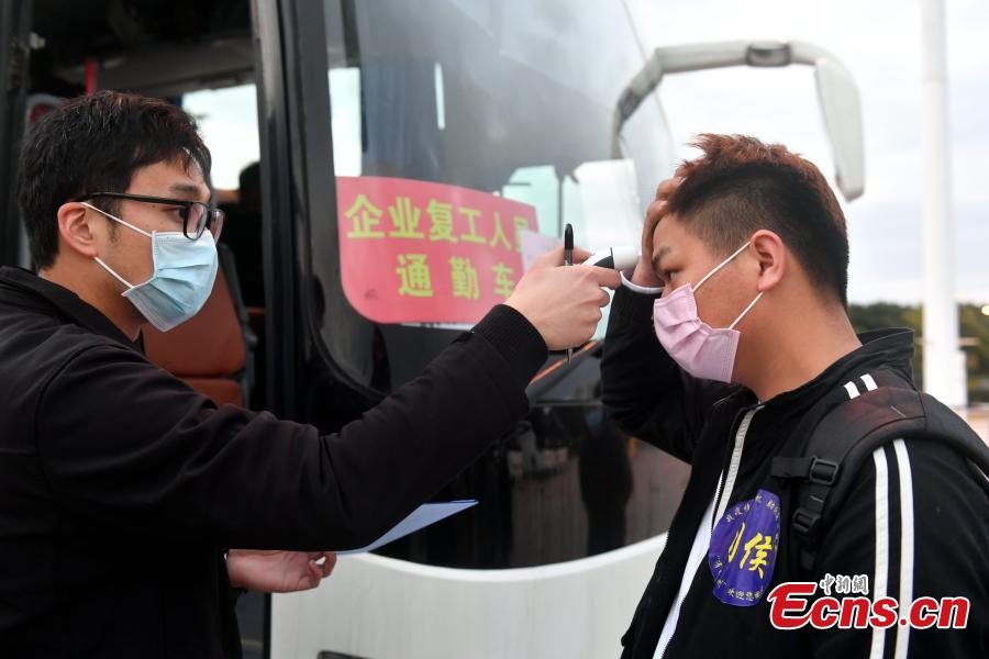 A passenger has his temperature checked before getting on a shuttle bus at the Fuzhou Changle International Airport in Fuzhou, South China’s Fujian province,Feb. 20, 2020. Two chartered planes carried over 300 workers from Kunming city of Yunnan province arrived at the airport on Thursday. To meet the employment demand of enterprises and reduce the risks of the epidemic spreading, cities in coastal provinces are using charter services to transport workers back to work. (Photo: China News Service/Lv Ming)