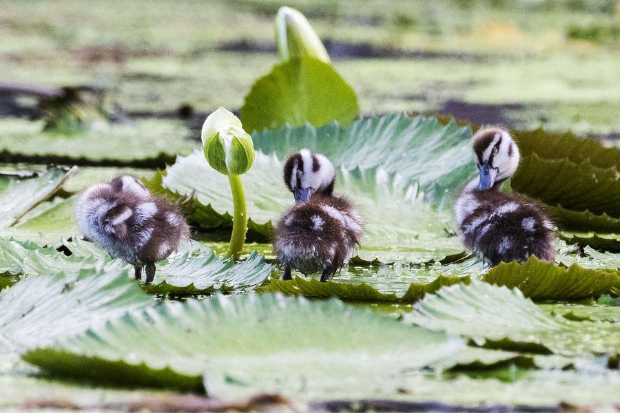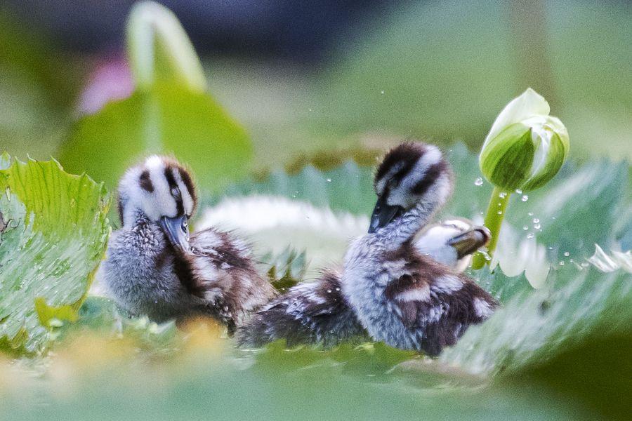Three young wild lesser whistling ducklings groom their down feathers in a pond in Singapore's Gardens by the Bay on Feb. 20, 2020. (Photo by Then Chih Wey/Xinhua)