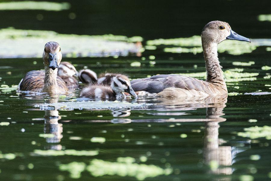 Young wild lesser whistling ducklings search for food in a pond in Singapore's Gardens by the Bay on Feb. 20, 2020. (Photo by Then Chih Wey/Xinhua)