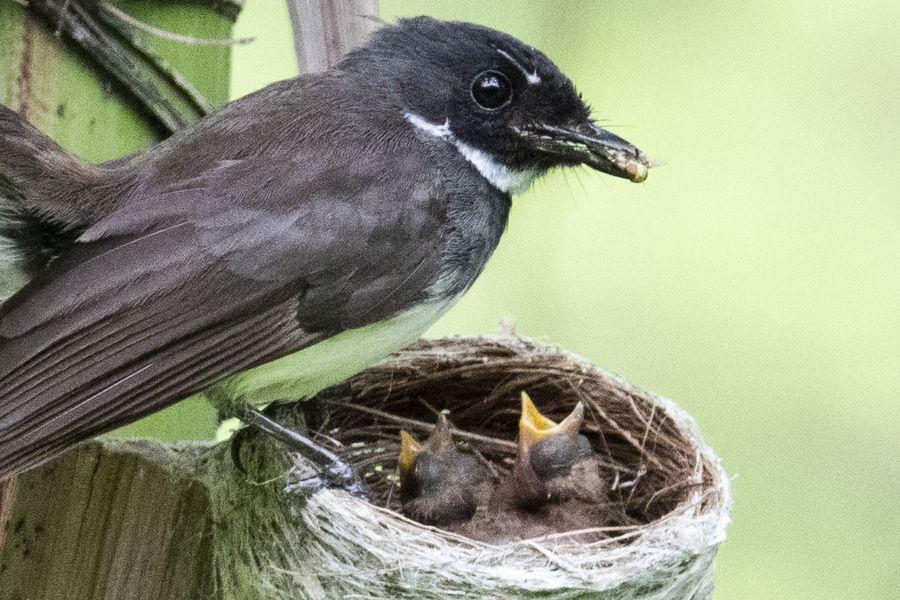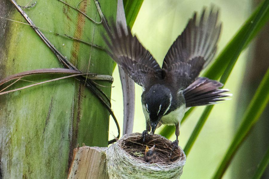 A young wild Malaysian pied fantail hatchling gets fed by a parent in their nest in Singapore's Gardens by the Bay on Feb. 19, 2020. (Photo by Then Chih Wey/Xinhua)