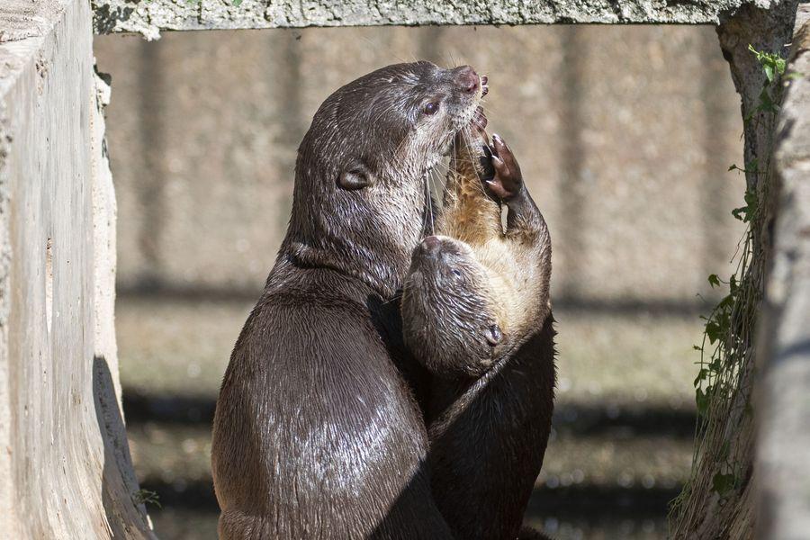 A wild smooth-coated otter holds one of her pup in its mouth on the banks of the Singapore River on Feb. 17, 2020. (Photo by Then Chih Wey/Xinhua)
