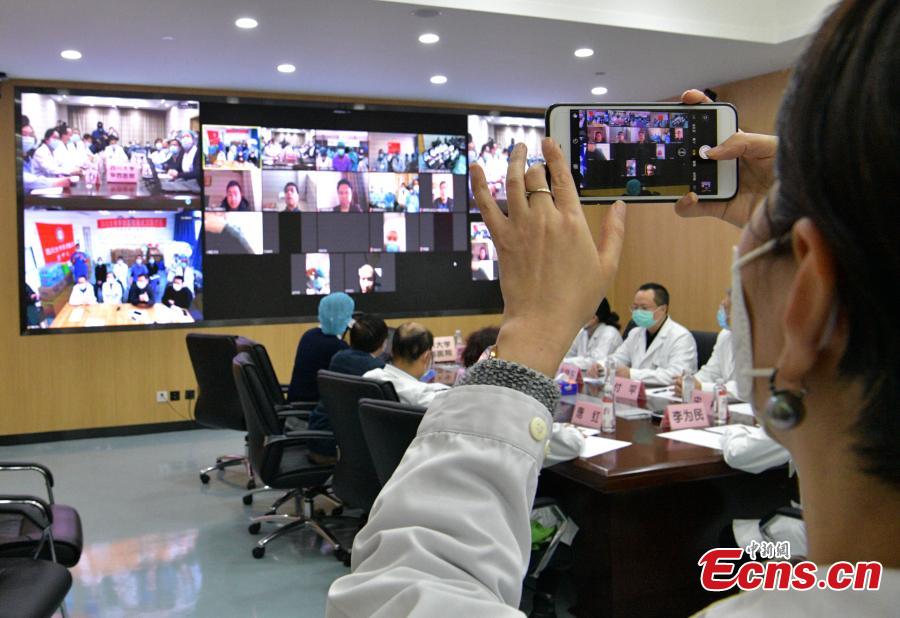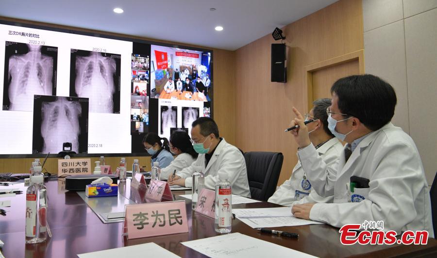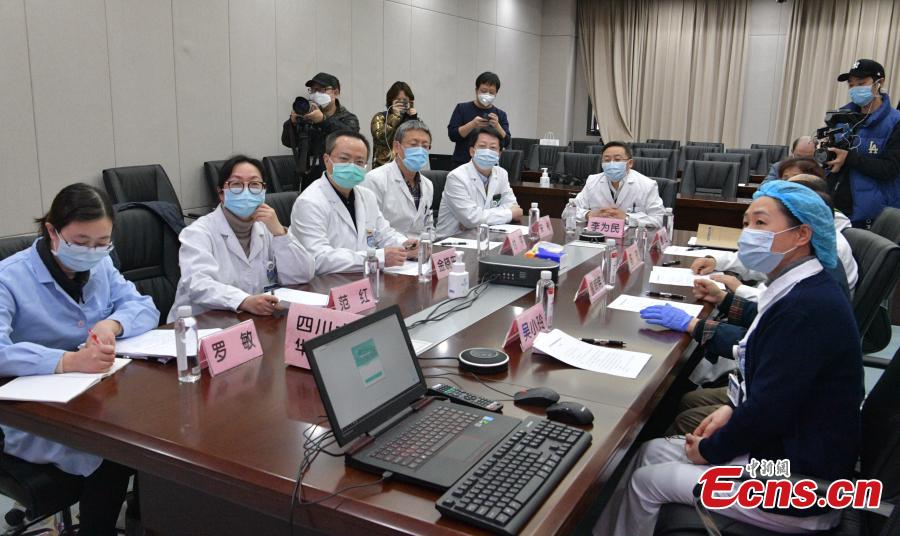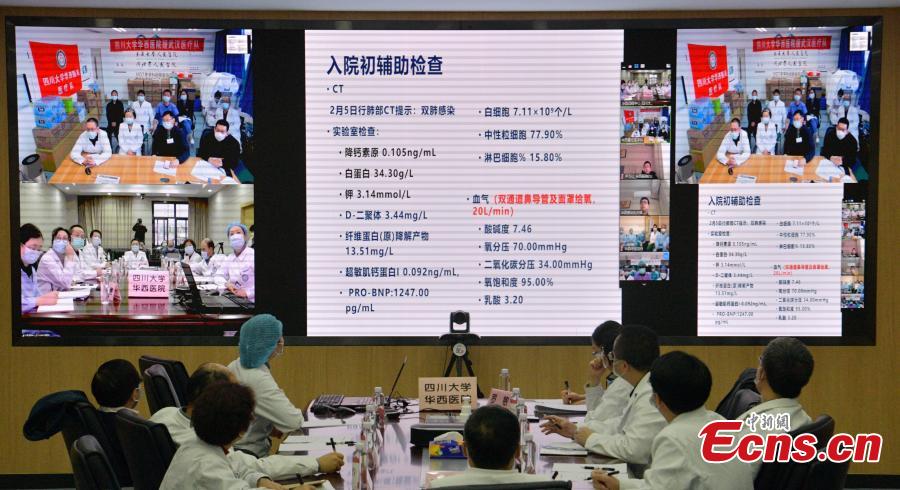 Doctors see ultrasound images of coronavirus patients in Wuhan during a 5G long-distance consultation in West China Hospital of Sichuan University in Chengdu, Southwest China’s Sichuan province on February 20, 2020. Through the Internet-based approach, specialists in leading hospitals outside Hubei province can give direction to grassroots doctors and suggestion on diagnosis and treatment. (Photo: China News Service/ Liu Zhongjun)