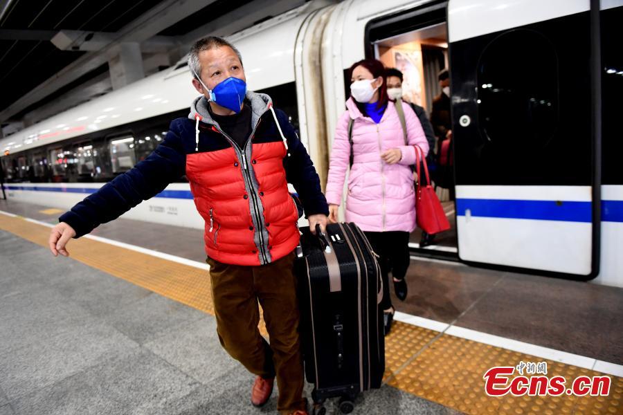 Passengers return to work at a train station in Guangzhou, South China’s Guangdong province on Feb 2020, 2020. A charter train with 926 migrant workers on board arrived at Guangzhou South Railway Station on Thursday night after a journey from Southwest China’s Sichuan province. (Photo: China News Service/ Ji Dong)
