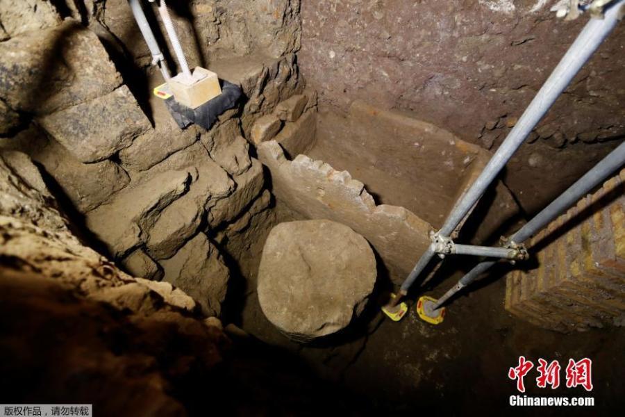 A 1.4-meter (55-inch) wide sarcophagus and what appears to be an altar, dating back to the 6th Century BCE, are seen in an underground chamber, at the ancient Roman Forum, during an unveiling to media, in Rome, Feb. 21, 2020. (Photo/Agencies)