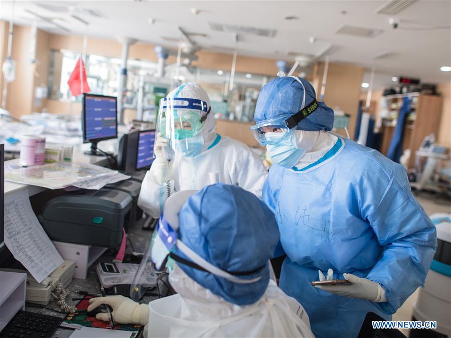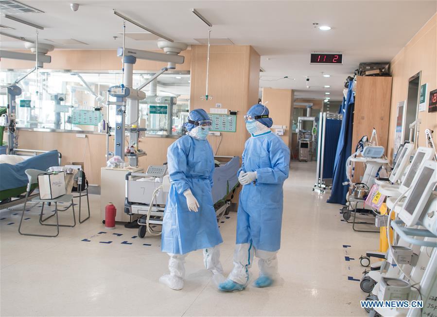 Head nurse Sun Chun (R) works with a colleague at an ICU ward of the First Hospital of Wuhan City in Wuhan, central China's Hubei Province, Feb. 22, 2020. Sun Chun is among the first batch of medical workers dispatched from the First Hospital to the makeshift hospital of Leishenshan (Thunder God Mountain) in Wuhan, the epicenter of the novel coronavirus outbreak. After finishing the work at Leishenshan, she returned to the First Hospital and remained in the frontline of fighting against the virus. By now, she has taken care of some 167 COVID-19 patients with various degrees of symptoms. (Xinhua/Xiao Yijiu)