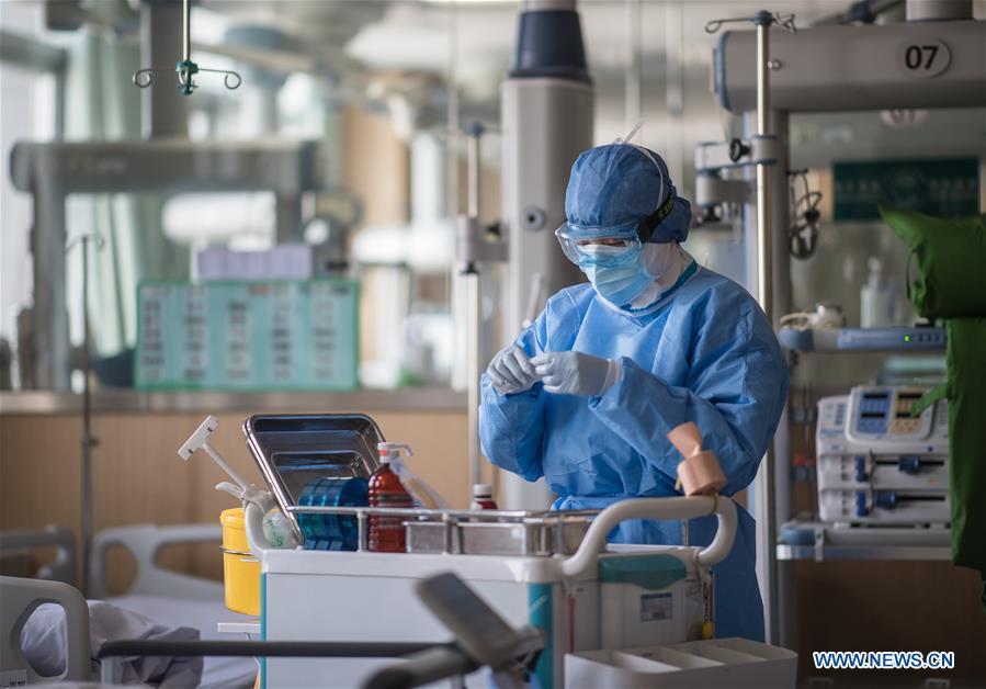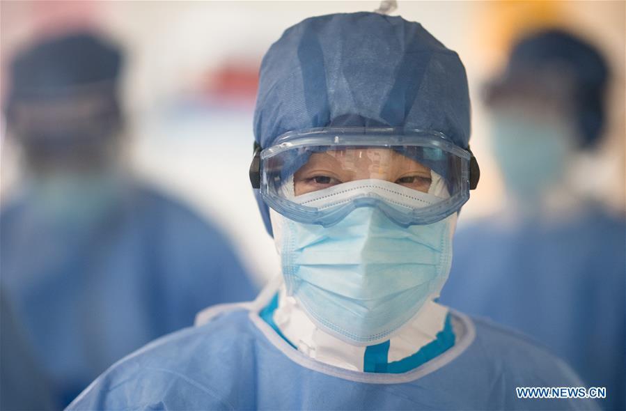 Head nurse Sun Chun is seen at an ICU ward of the First Hospital of Wuhan City in Wuhan, central China's Hubei Province, Feb. 22, 2020. Sun Chun is among the first batch of medical workers dispatched from the First Hospital to the makeshift hospital of Leishenshan (Thunder God Mountain) in Wuhan, the epicenter of the novel coronavirus outbreak. After finishing the work at Leishenshan, she returned to the First Hospital and remained in the frontline of fighting against the virus. By now, she has taken care of some 167 COVID-19 patients with various degrees of symptoms. (Xinhua/Xiao Yijiu)