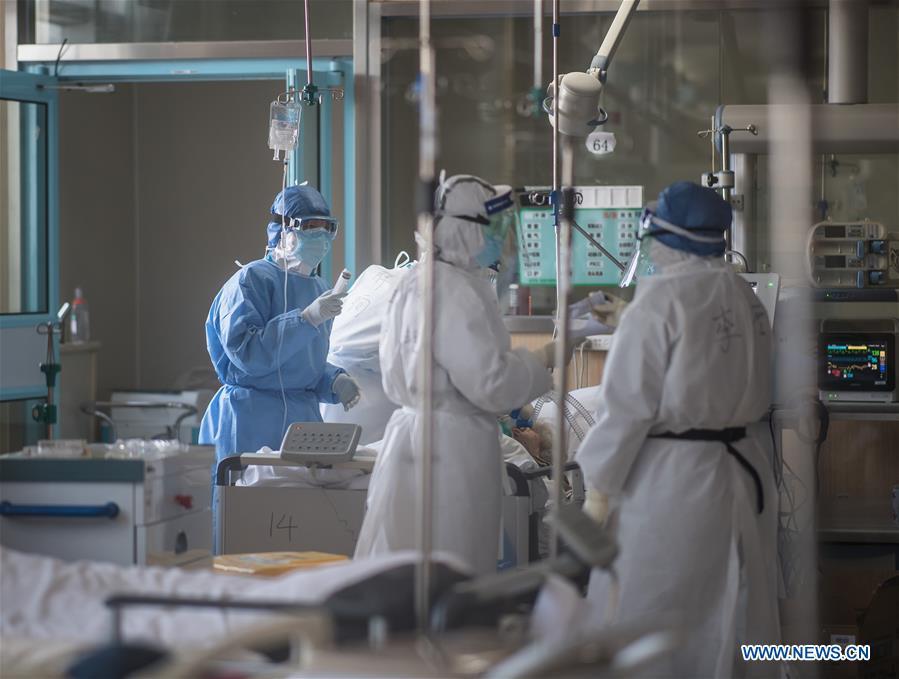 Head nurse Sun Chun (1st L) takes care of a COVID-19 patient at an ICU ward of the First Hospital of Wuhan City in Wuhan, central China's Hubei Province, Feb. 22, 2020. Sun Chun is among the first batch of medical workers dispatched from the First Hospital to the makeshift hospital of Leishenshan (Thunder God Mountain) in Wuhan, the epicenter of the novel coronavirus outbreak. After finishing the work at Leishenshan, she returned to the First Hospital and remained in the frontline of fighting against the virus. By now, she has taken care of some 167 COVID-19 patients with various degrees of symptoms. (Xinhua/Xiao Yijiu)