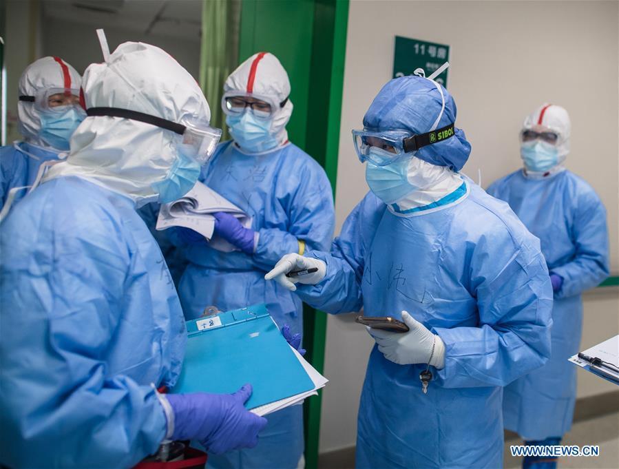 Head nurse Sun Chun (2nd R) arranges tasks to her colleague Li Min at the First Hospital of Wuhan City in Wuhan, central China's Hubei Province, Feb. 22, 2020. Sun Chun is among the first batch of medical workers dispatched from the First Hospital to the makeshift hospital of Leishenshan (Thunder God Mountain) in Wuhan, the epicenter of the novel coronavirus outbreak. After finishing the work at Leishenshan, she returned to the First Hospital and remained in the frontline of fighting against the virus. By now, she has taken care of some 167 COVID-19 patients with various degrees of symptoms. (Xinhua/Xiao Yijiu)