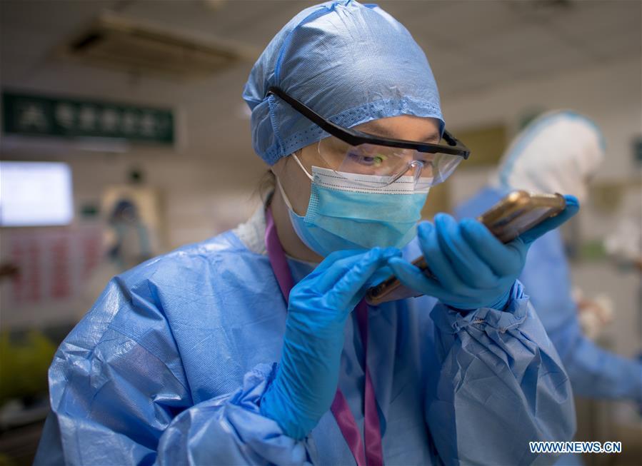 Head nurse Sun Chun arranges tasks by cellphone at the First Hospital of Wuhan City in Wuhan, central China's Hubei Province, Feb. 22, 2020. Sun Chun is among the first batch of medical workers dispatched from the First Hospital to the makeshift hospital of Leishenshan (Thunder God Mountain) in Wuhan, the epicenter of the novel coronavirus outbreak. After finishing the work at Leishenshan, she returned to the First Hospital and remained in the frontline of fighting against the virus. By now, she has taken care of some 167 COVID-19 patients with various degrees of symptoms. (Xinhua/Xiao Yijiu)