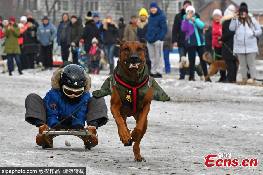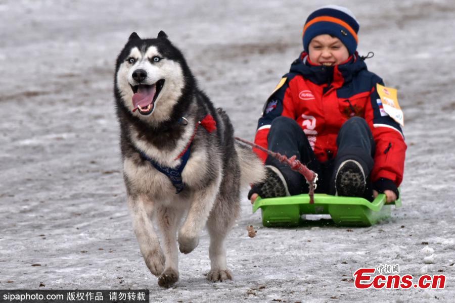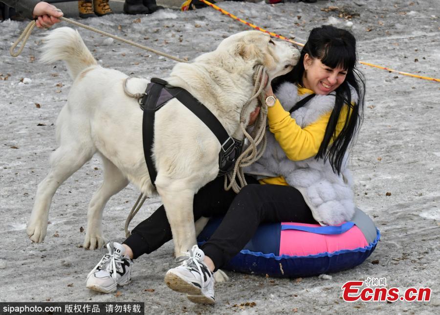 A dog competes at the Khakassia Republican Hippodrome during the first sled dog race in Russia's Republic of Khakassia on February 22, 2020. (Photo/Sipaphoto)