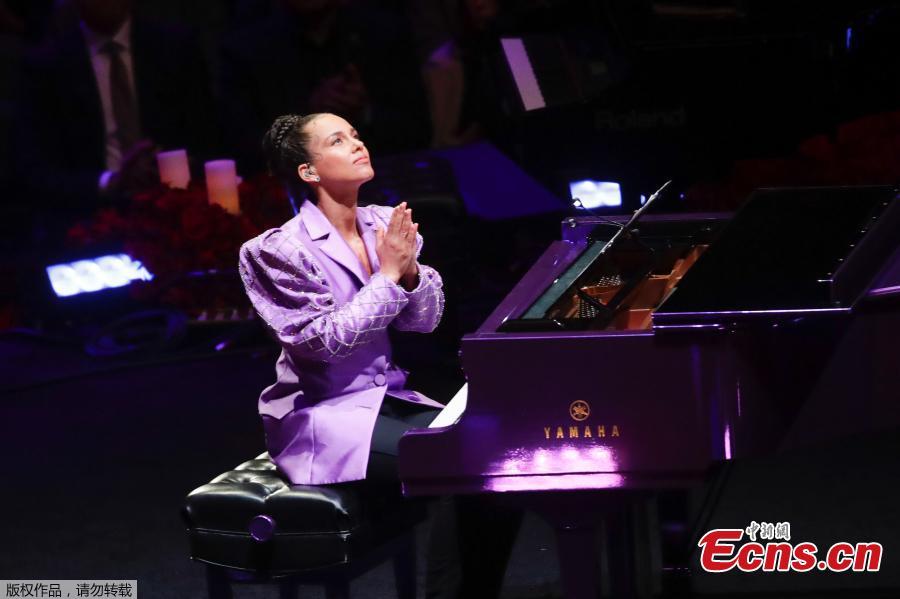 Music star Alicia Keys pays tribute after performing at Monday's memorial to Bryant and Gianna, who were among nine killed in a helicopter crash on Jan. 26 in Los Angeles. (Photo/Agencies)