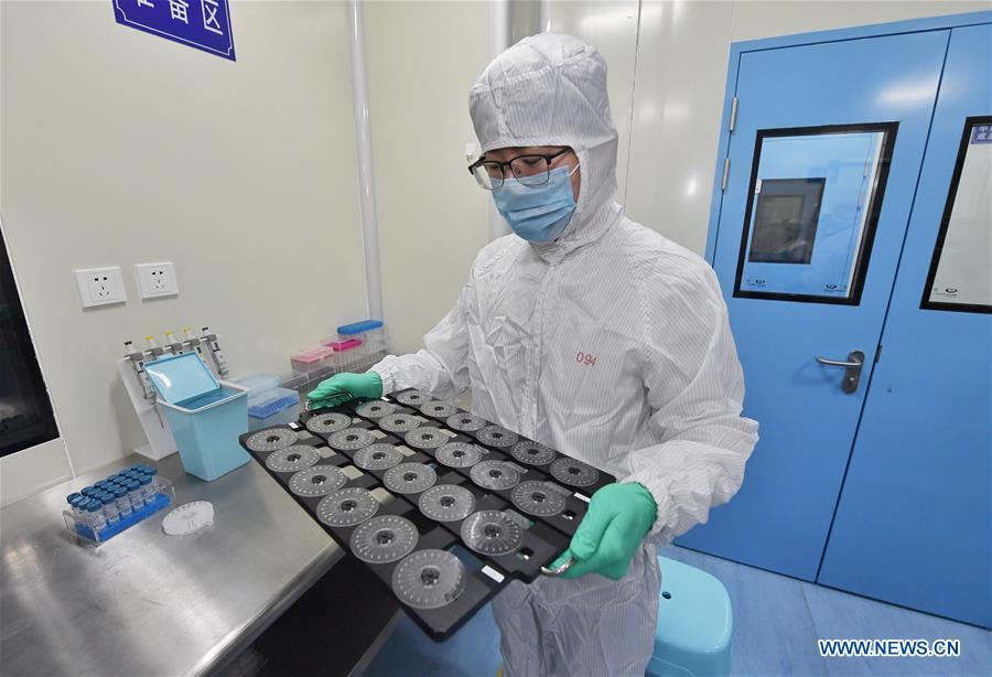A staff works at the plant of a Chengdu-based biotech company in southwest China's Sichuan Province, Feb. 24, 2020. A newly developed nucleic acid test chip that can detect and distinguish six respiratory viruses, including the novel coronavirus, has been approved by China's National Medical Products Administration. The virus chip was the result of joint work of experts from prestigious West China Hospital affiliated to Sichuan University, Tsinghua University in Beijing and a Chengdu-based biotech company. It was designed and developed under the guidance of renowned Chinese respiratory specialist Zhong Nanshan and epidemiologist Li Lanjuan. The two academicians with the Chinese Academy of Engineering are also members of a national expert team set up for the control and prevention of the novel coronavirus epidemic. (Xinhua/Liu Kun)