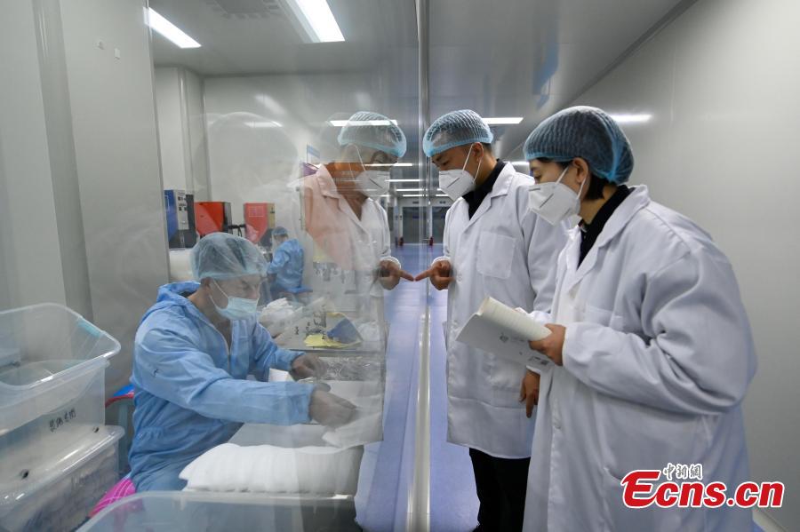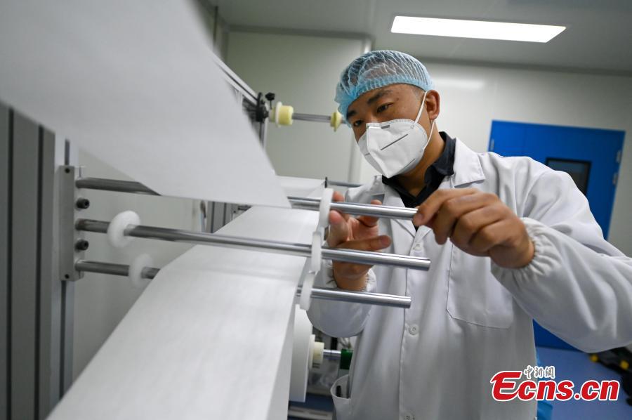 Guan Xunze, manager of a facial mask factory, checks facilities in a workshop in Shenyang, Northeast China’s Liaoning province, Feb. 24, 2020. Guan, chairman of a local biotechnology firm, set up the facial mask plant in 11 days to cope with a short supply of facial masks amid the coronavirsu outbreak. (Photo: China News Service/ Yu Haiyang)