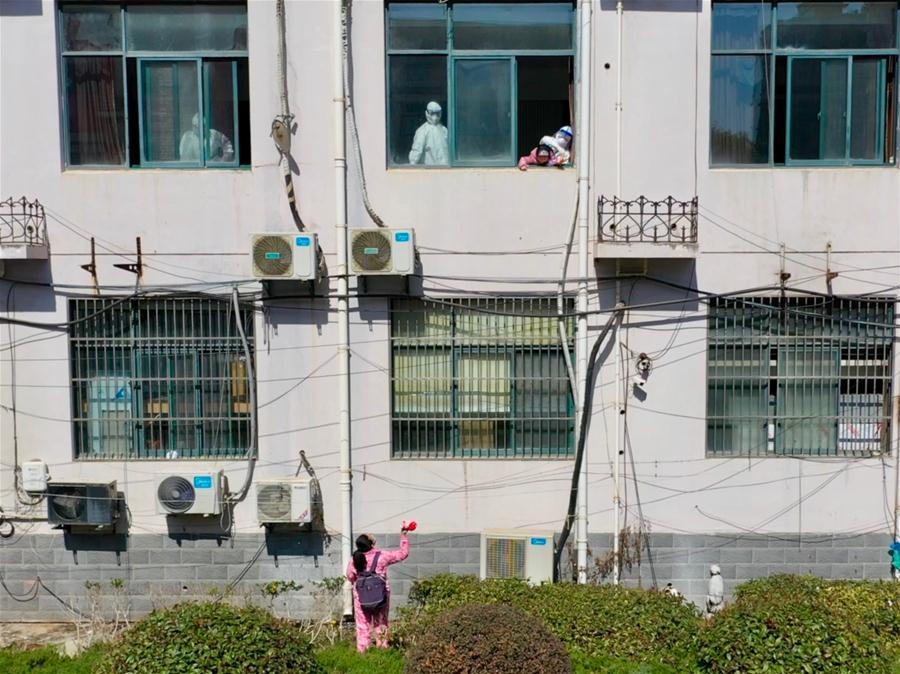Zhao Rui (pseudonym), a cured patient of novel coronavirus, gestures to her daughter and the temporary "mothers" at an isolation area in Yingjiang District of Anqing City, east China's Anhui Province, Feb. 20, 2020. Zhao Rui is the hostess of an ordinary family living in Yingjiang District of Anqing City in east China's Anhui Province. After the outbreak of the novel coronavirus disease, all the adult members of her family were unfortunately infected with the virus and sent to hospital for medical treatment, leaving two young children unattended. Learning their story, six nurses from local medical institutions took on the responsibility of taking care of the children, acting as their temporary "mothers". On Feb. 20, Zhao Rui was discharged from hospital after recovery and transferred to a quarantine to stay for another 14 days. In the quarantine, for the first time since she got infected, she had finally saw her children, in another building, in temporary mothers' arms. She waved to them and promised a reunion after 14 days. Under the arrangement of the staff members, she met with two temporary "mothers", Zhu Yan and Zu Lulu, at the isolation ward and knew that the number of temporary "mothers" has increased from 6 to 9. She made a bow to them from 2 meters away to show her gratitude. (Xinhua/Tang Yang)