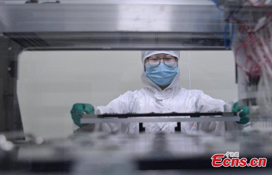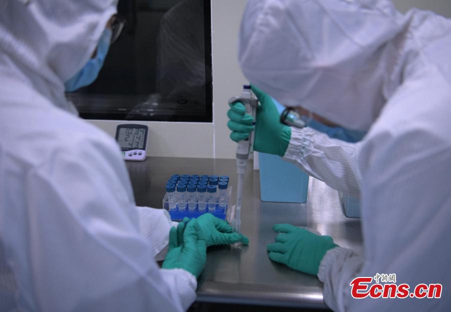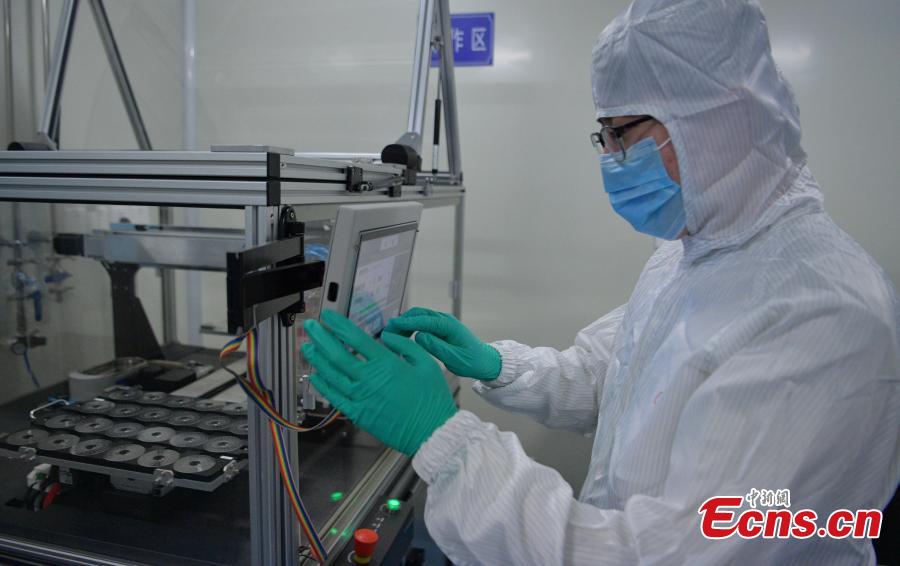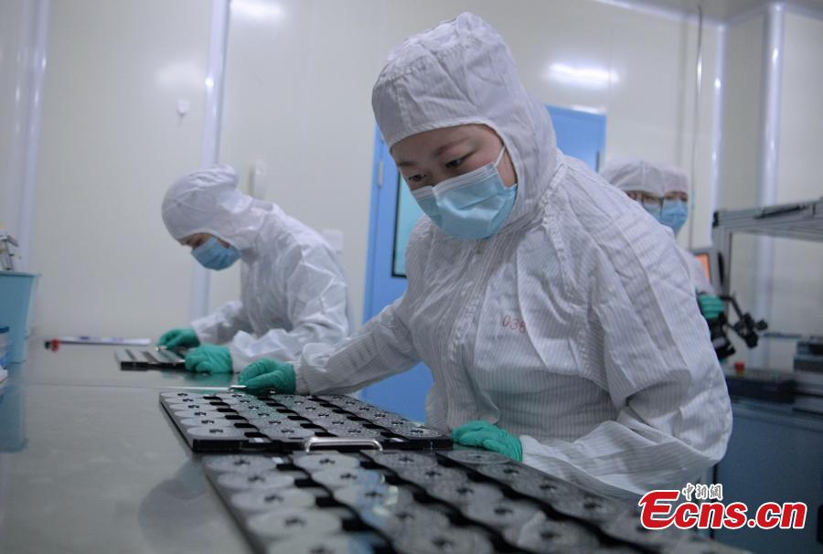 Staff process nucleic acid test chip at the plant of a Chengdu-based biotech company in southwest China's Sichuan Province, Feb. 24, 2020. A newly developed nucleic acid test chip that can detect and distinguish six respiratory viruses, including the novel coronavirus, has been approved by China's National Medical Products Administration. The virus chip was the result of joint work of experts from prestigious West China Hospital affiliated to Sichuan University, Tsinghua University in Beijing and a Chengdu-based biotech company. It was designed and developed under the guidance of renowned Chinese respiratory specialist Zhong Nanshan and epidemiologist Li Lanjuan. The two academicians with the Chinese Academy of Engineering are also members of a national expert team set up for the control and prevention of the novel coronavirus epidemic. (Photo: China News Service/ Liu Zhongjun)