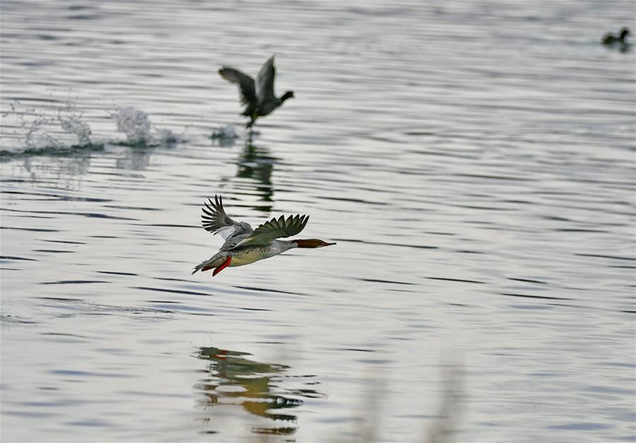 Water birds fly above the water at Lhalu wetland in Lhasa, southwest China's Tibet Autonomous Region, Feb. 24, 2020. Lhalu Wetland National Nature Reserve, known as "the Lung of Lhasa", gets rejuvenated as temperature rises. (Xinhua/Zhang Rufeng)