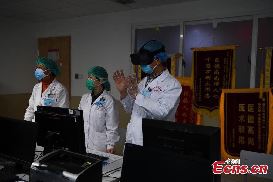 With the help of 5G technology, a doctor wearing a virtual reality helmet check health condition of a patient with suspected novel coronavirus infection in a hospital in Kunming, Southwest China’s Yunnan province, Feb.24, 2020. (Photo: China News Service/ Kang Ping)