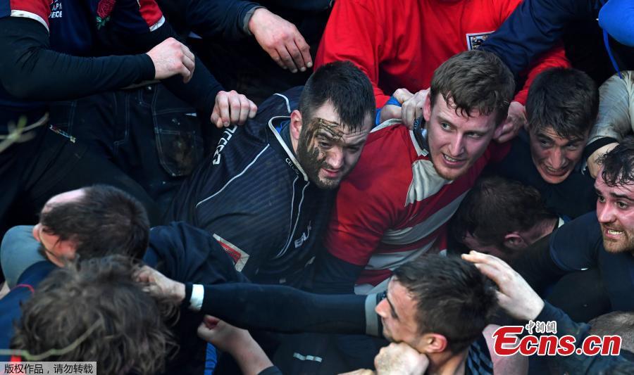 Competitors from the opposing teams, the Up'ards and the Down'ards, reach for the ball during the annual Royal Shrovetide Football Match in Ashbourne, northern England, on February 25, 2020. The mass-participation ball game involves two teams, whose players are defined by which side of a small brook that bisects the town they were born, aiming to score a goal, which are some three miles apart. The game, which has very few rules, is played over two 8 hour periods on Shrove Tuesday and Ash Wednesday. Royal Shrovetide Football is believed to have been played annually in Ashbourne since 1667. (Photo/Agencies)