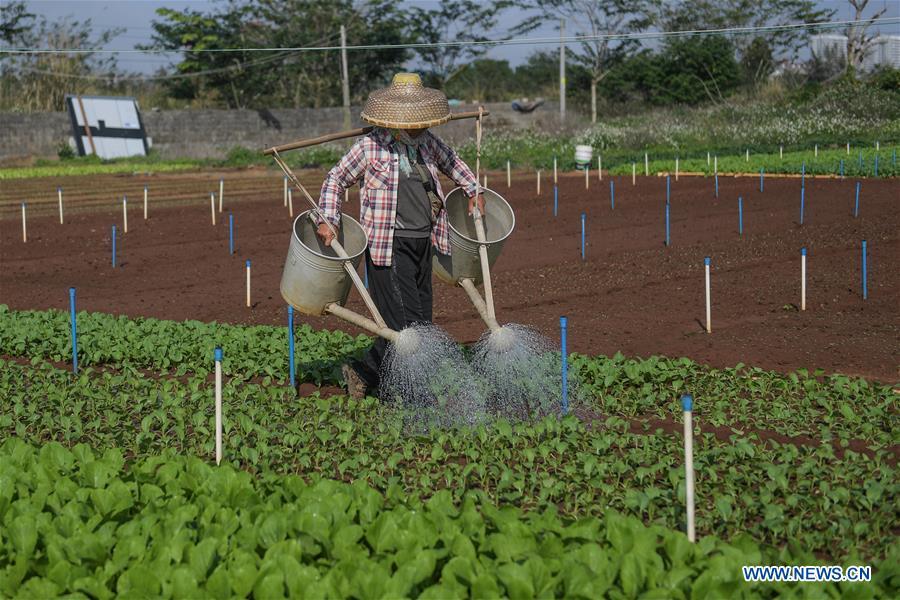 A farmer waters a field in Shapo Vegetable Base in Haikou, south China's Hainan province, Feb. 25, 2020. (Xinhua/Pu Xiaoxu)