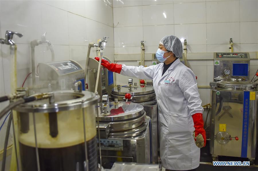 Zhou Lei, a pharmacist of traditional Chinese medicine (TCM), prepares herbs to produce doses of TCM decoctions to help combat the novel coronavirus epidemic at Xiaogan Chinese Medical Hospital in Xiaogan City, central China's Hubei Province, Feb. 25, 2020. TCM has been widely applied in treating infected patients as it has proved effective in improving the cure rate. Since the epidemic outbreak, the time-honored treatment has been applied in treating over 60,000 confirmed cases of the infection in China. (Xinhua/Hu Huhu)