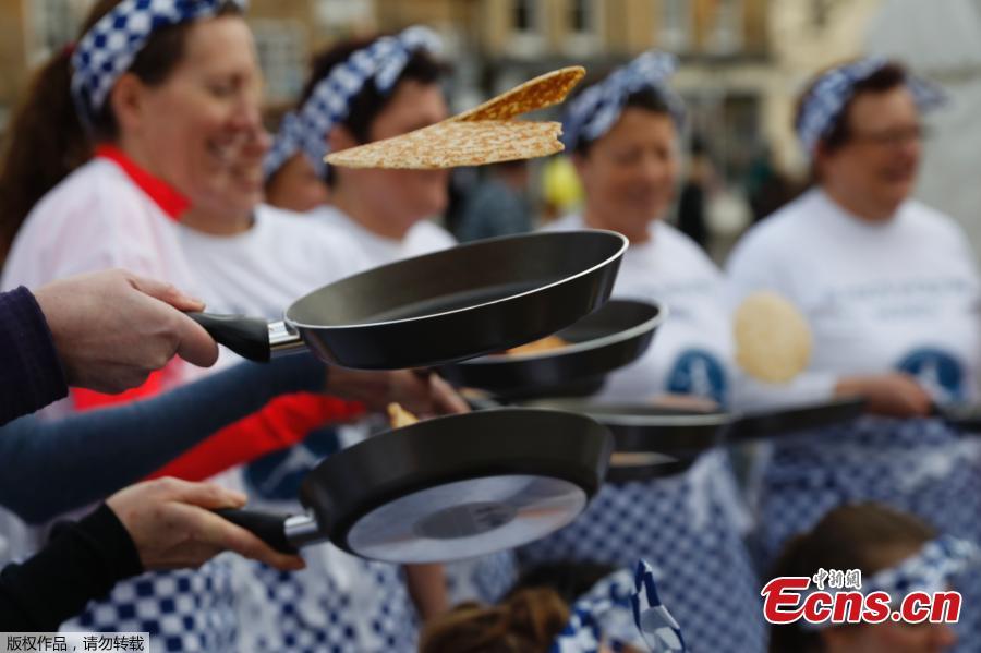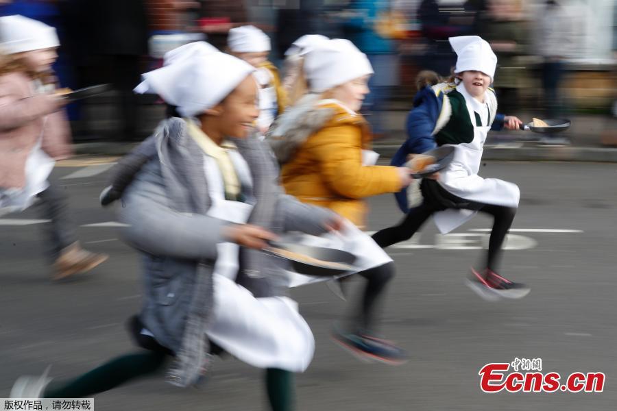 Brits celebrated Shrove Tuesday, commonly dubbed Pancake Day, with the annual pancake race in in Olney, Buckinghamshire, UK, Feb.25, 2020.(Photo/Agencies)