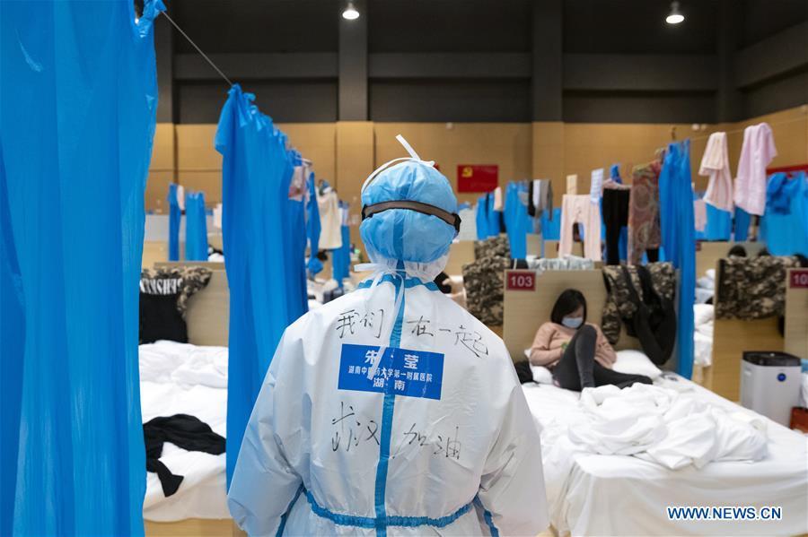 A medical worker makes the rounds of the wards at a temporary hospital in Jiangxia District in Wuhan, central China's Hubei Province, Feb. 25, 2020. The first batch of 23 patients walked out of the first temporary hospital featuring traditional Chinese medicine (TCM) Wednesday in Wuhan, the epicenter of the coronavirus outbreak in central China's Hubei Province. The make-shift hospital in Wuhan's Jiangxia District was transformed from a sports center. Medical staff from 20 TCM hospitals of five provinces took charge of the infected patients in the hospital with support from the district TCM hospital. It is Wuhan's first temporary hospital that followed the treatment and management mode of TCM hospitals in China. According to the National Administration of Traditional Chinese Medicine, TCM has joined in the rescue work for more than 60,000 infected people in the country. (Xinhua/Shen Bohan)