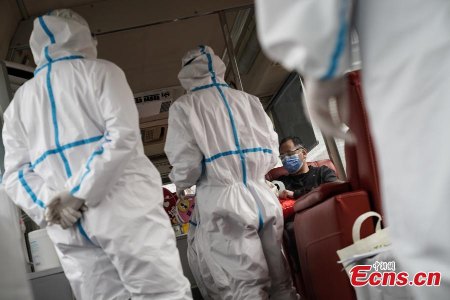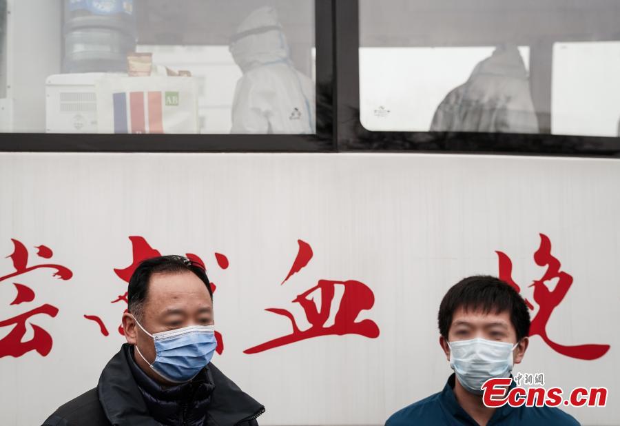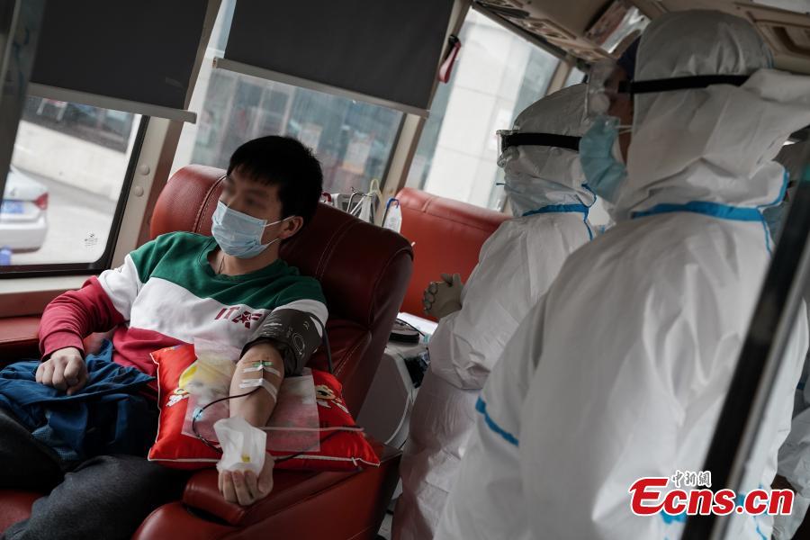 Recovered coronavirus patients donate plasma in a blood donation bus at the Beijing You'an Hospital in Beijing, Feb. 27, 2020. (Photo: China News Service/ Cui Nan)