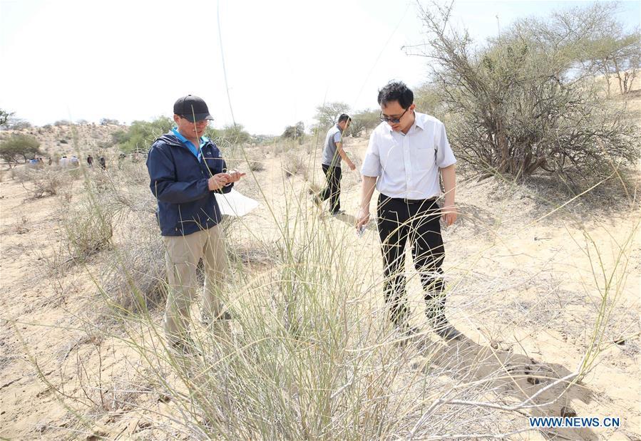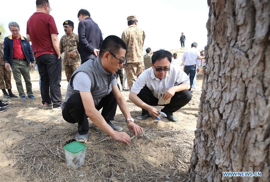 Chinese locust experts look for eggs of locust in Tharparkar desert of Sindh province, Pakistan, Feb. 26, 2020. Chinese locust experts on Wednesday inspected the Tharparkar desert, which was attacked by desert locust last November and is recognized as a summer breeding place for locust. (Xinhua/Liu Tian)