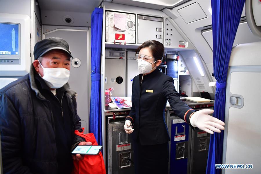 Returning workers take a chartered airplane of Shenzhen Airlines heading for Zhejiang Province at Xi'an Xianyang International Airport in Xianyang, northwest China's Shaanxi Province, Feb. 27, 2020, Five chartered airplanes of Shenzhen Airlines carried returning workers back to work Thursday. (Xinhua/Shao Rui)
