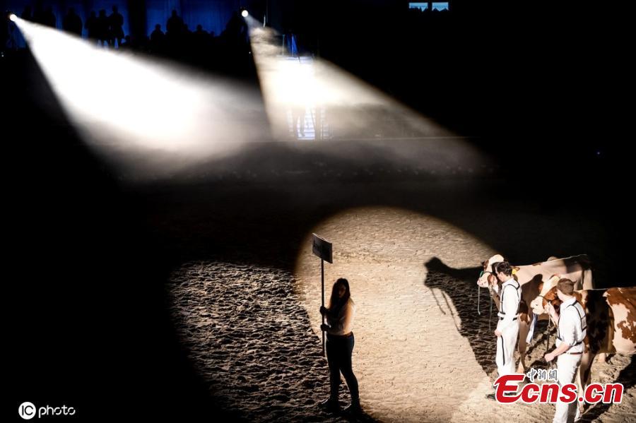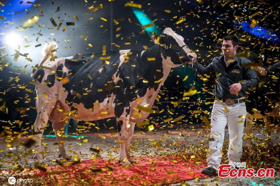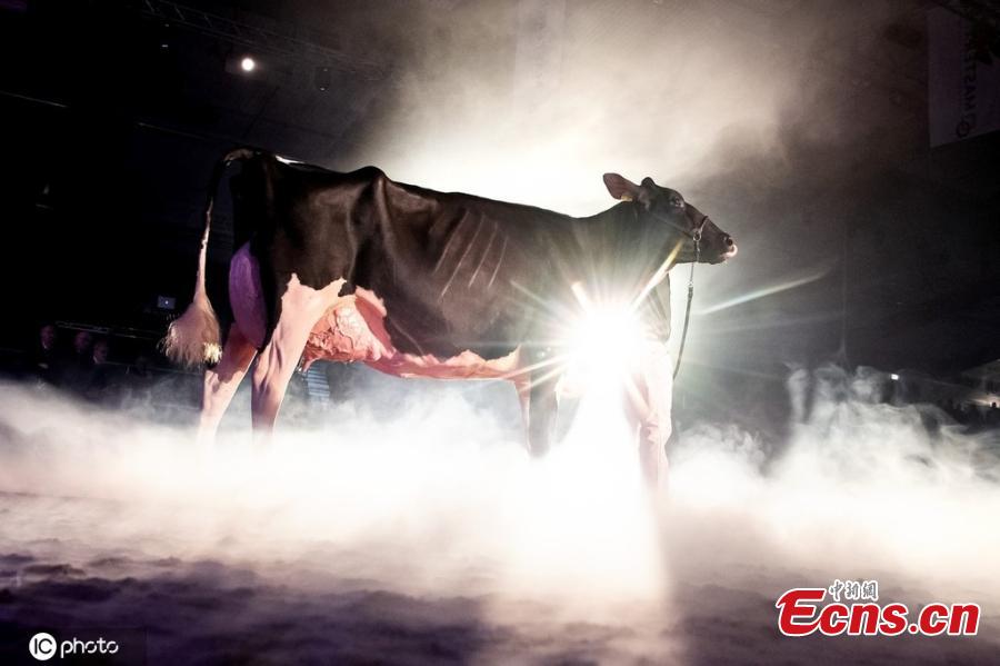 A cow is shown through the hall at the cattle breeding exhibition "The show of the best". Over 200 Holstein dairy cows are presented by their owners at the 47th edition of the "Schau der Besten". The evaluation criteria for the prospective beauty queens are, among others, beautiful udders, strong legs and a wide pelvis. (Photo/IC)