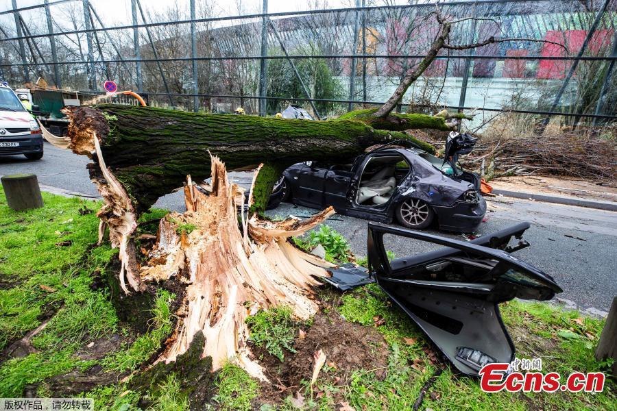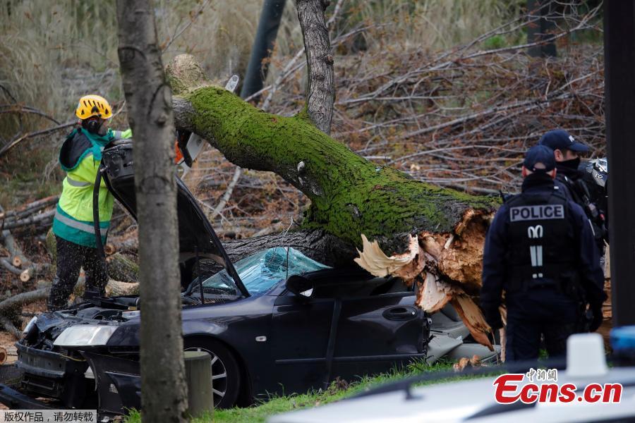 Rescue workers clean the area after a tree crashed on a car in Paris, Thursday, Feb. 27, 2020. Powerful winds sent a tree crashing down onto a car near the Eiffel Tower, killing the driver on the spot. The Paris fire brigade said it was among more than 100 storm-related accidents in the Paris region on Thursday, as sudden gusts of wind and rain swept the area. (Photo/Agencies)