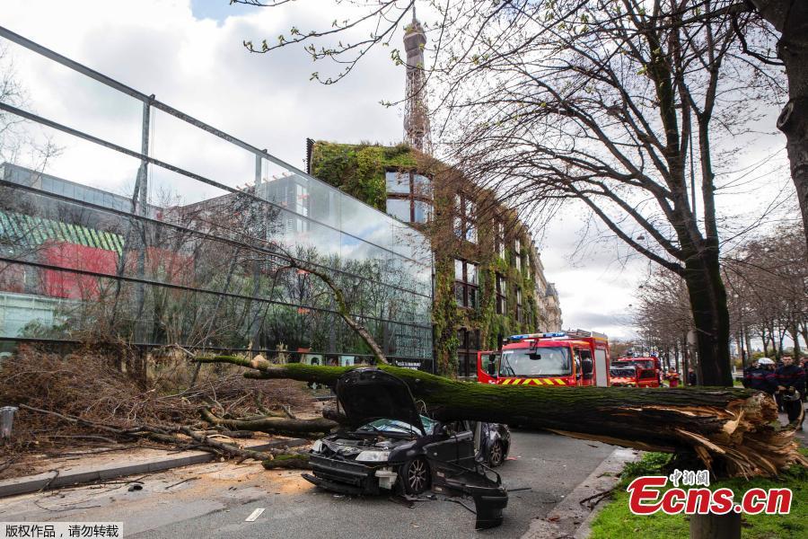 Powerful winds sent a tree crashing down onto a car near the Eiffel Tower, killing the driver on the spot. The Paris fire brigade said it was among more than 100 storm-related accidents in the Paris region on Thursday, as sudden gusts of wind and rain swept the area. (Photo/Agencies)