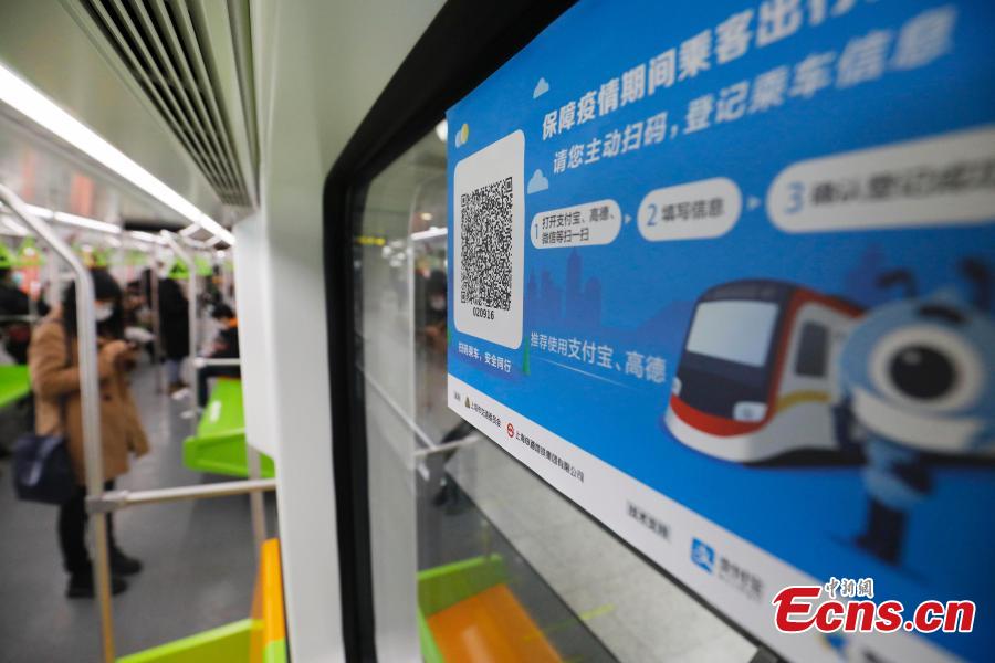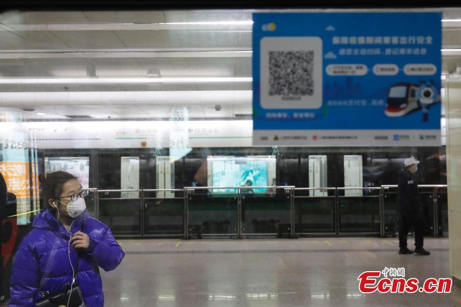Passengers are seen at a subway station in Shanghai, Feb.28, 2020. The QR code which tracks passengers is introduced to Metro trains in the city. Passengers who scan the code and enter their mobile phone number in an app will be contacted for the purpose of prevention of the spread of coronavirus. (Photo: China News Service/Yin Liqin)