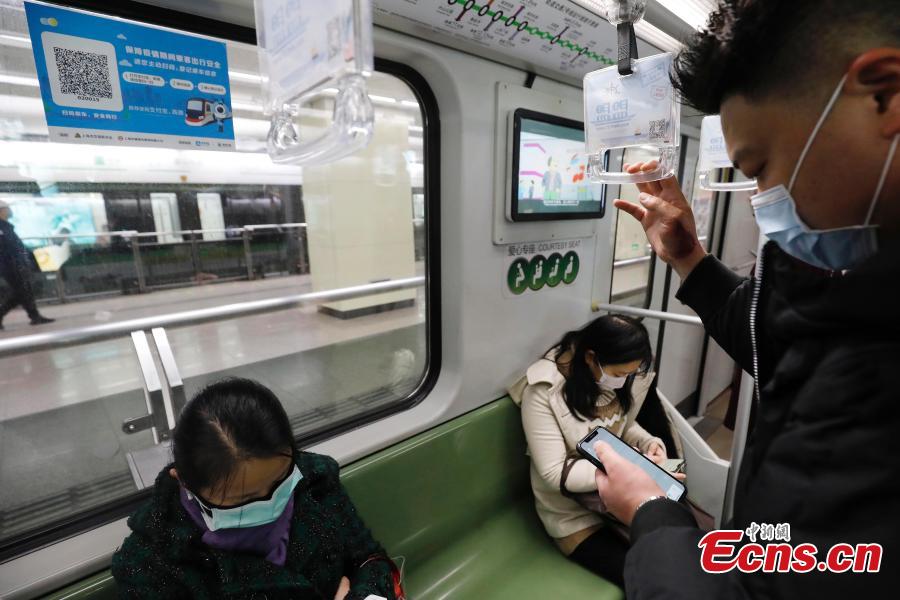 A view of a subway car in Shanghai, Feb.28, 2020. The QR code which tracks passengers is introduced to Metro trains in the city. Passengers who scan the code and enter their mobile phone number in an app will be contacted for the purpose of prevention of the spread of coronavirus. (Photo: China News Service/Yin Liqin)