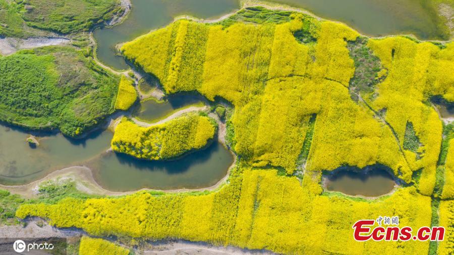 An aerial view shows rapeseed flower fields in Qingshen county of Southwest China's Sichuan province. (Photo/IC)